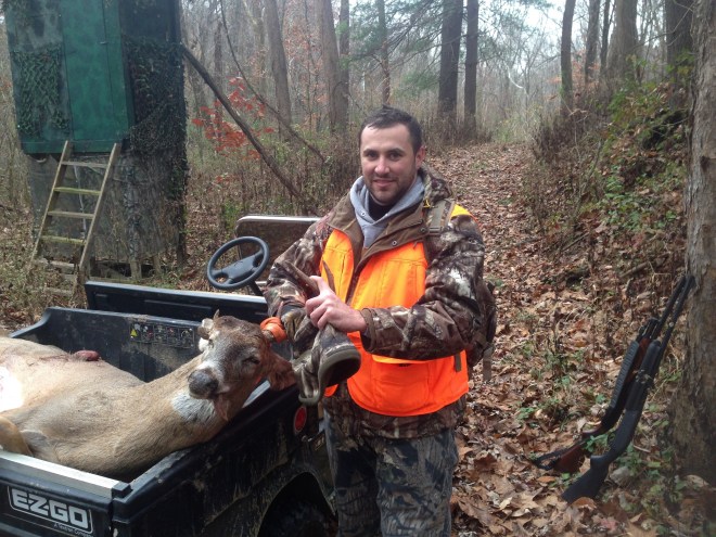 Fortunately a fellow hunter at work, and now good friend, Jermey let me borrow his shotgun since he wasn’t going to be able to hunt that weekend. After freezing my butt off for 2 days, I had a buck looking for some loving from a doe come walking by at 10 yards just after sunrise. I was so nervous that I missed with my first shot but was able to hit it with my second as it took off and I watched him kick. He ran another 30 yards then started walking, I got nervous that I had missed or even worse only wounded him. I watched him walk off deeper into the woods and after 15 minutes got down to look for blood. I found nothing, nothing at either shot locations, or the path that he ran along. I climbed back in my stand to think about what had just happened. After 2 hours I decided to climb down and head back for lunch, but first I would go see if I could find blood one more time. I went 15 yards further this time and found a river of blood where the deer had started walking it and had poured out. After tracking him for 300 yards I found him, I had hit just behind his ribs so the hole had been plugged that why the blood trail wasn’t heavy.